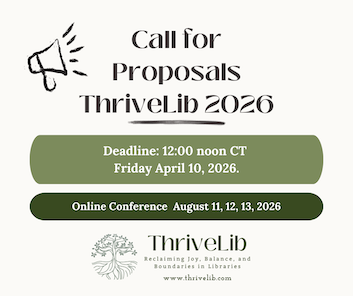 We’re excited to invite proposals for ThriveLib 2026! ThriveLib: Reclaiming Joy, Balance, and Boundaries in Libraries is a virtual conference for librarians, library managers, and library workers who want more sustainable, humane library workplaces. Library workers are navigating burnout, moral injury, and growing strain. ThriveLib exists to create space for honest conversation, shared learning, and practical strategies that center the well-being of the people who sustain our libraries every day.